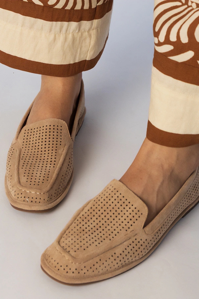 Sandfarbene durchbrochene Mokassins aus Kunstwildleder, „Stanila"