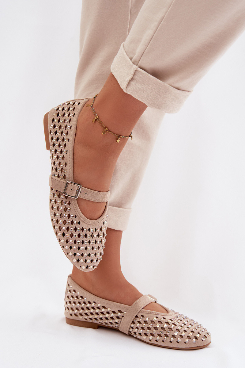Damen Ballerinas mit luftigen Elementen, glitzernden Steinen und Riemchen in sandfarbener Nilvessa