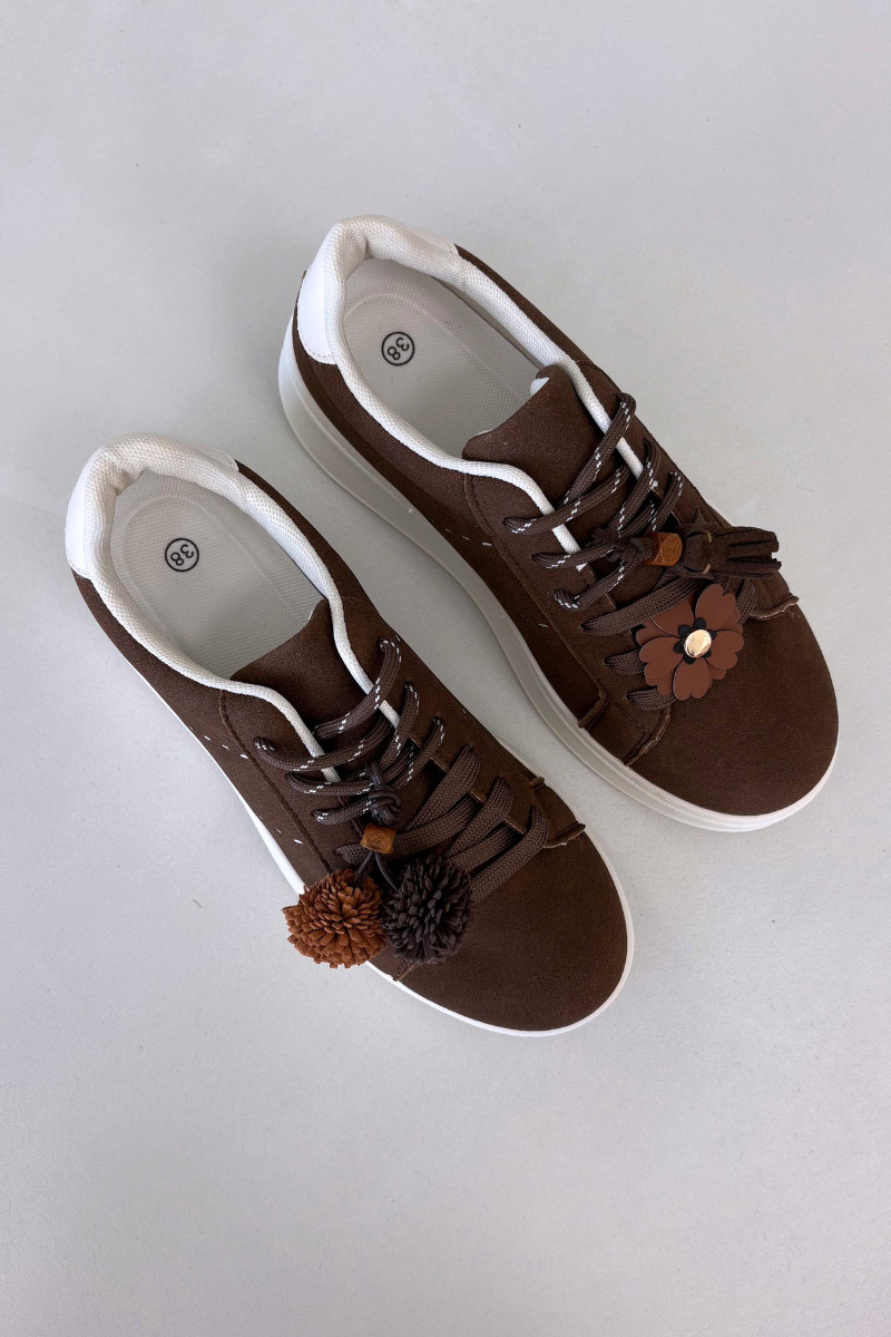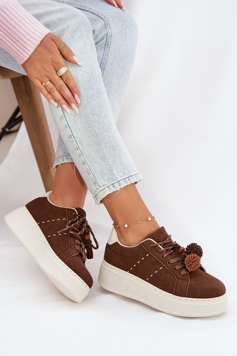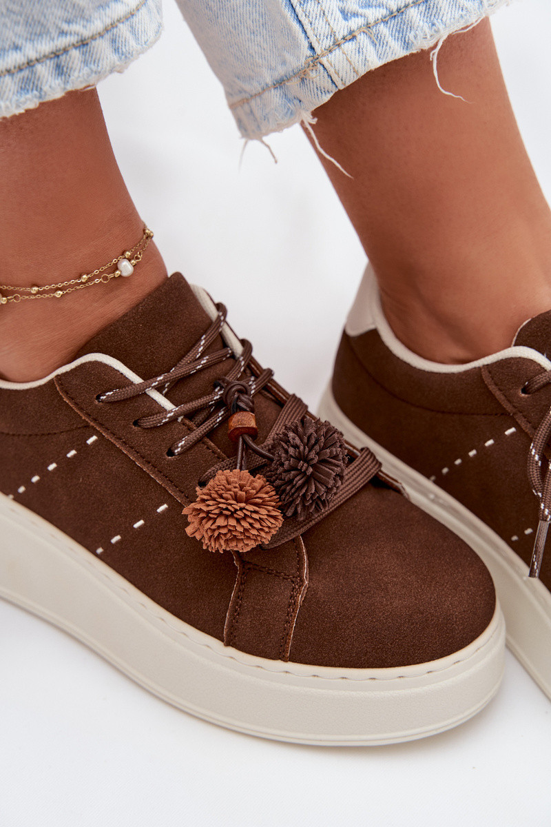 Schokoladenfarbene Corinna Damen Plattform Sport Sneakers mit dekorativen Pompons