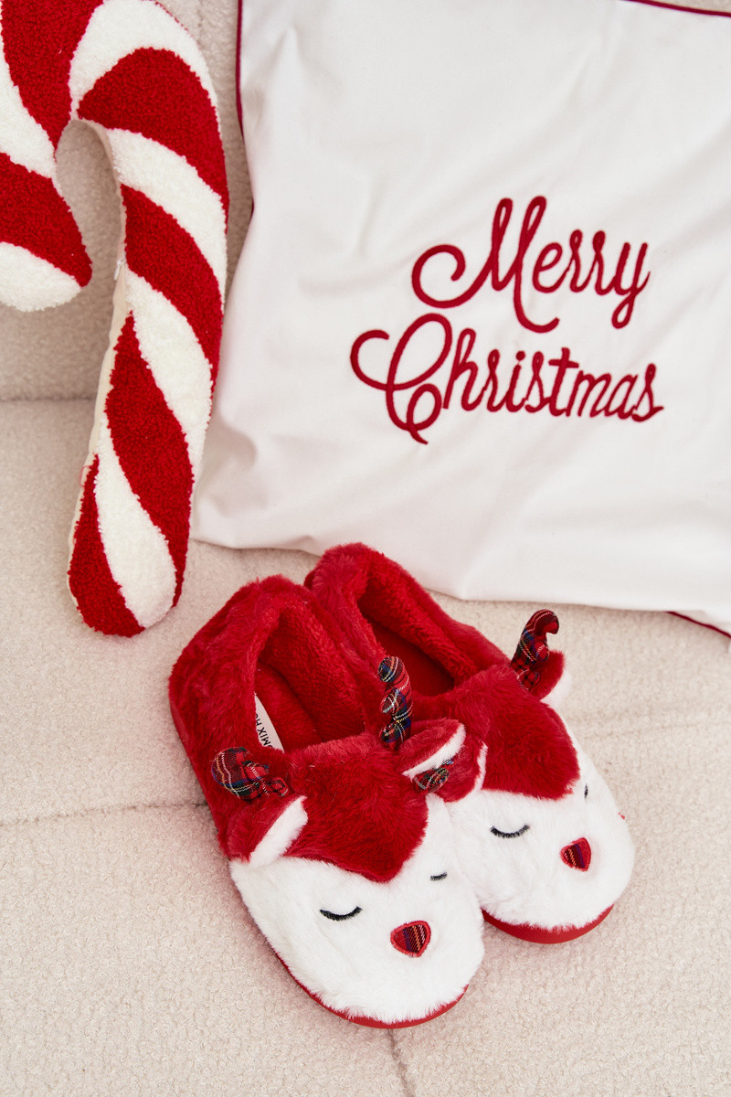 Rote Orsella Weihnachts-Hausschuhe für Frauen mit Fell und Rentiermotiven
