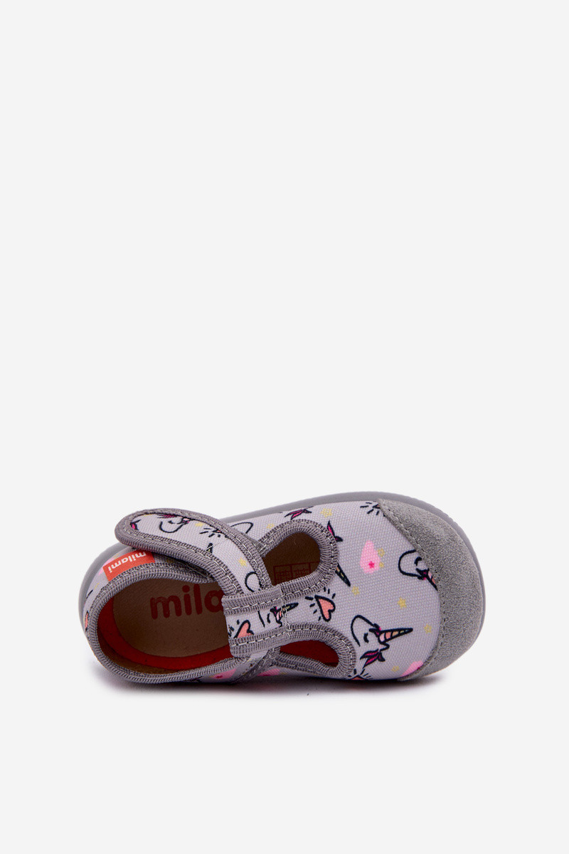 Hausschuhe Milami Kindisch Elastyczne mit Klebeverschlüssen Einhörnerc graue Farbe Ambette
