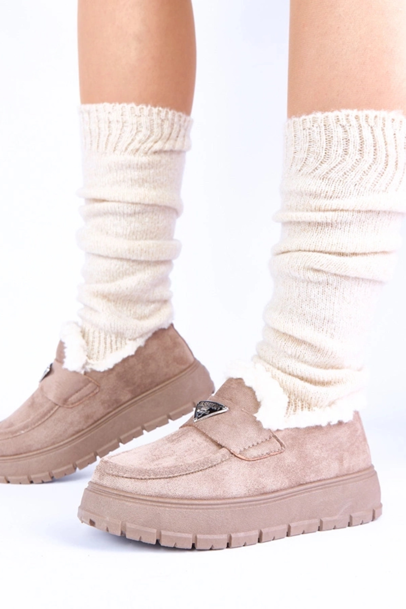 Dunkel-sandfarbene Mokassins auf Plattform mit Fell Kirby