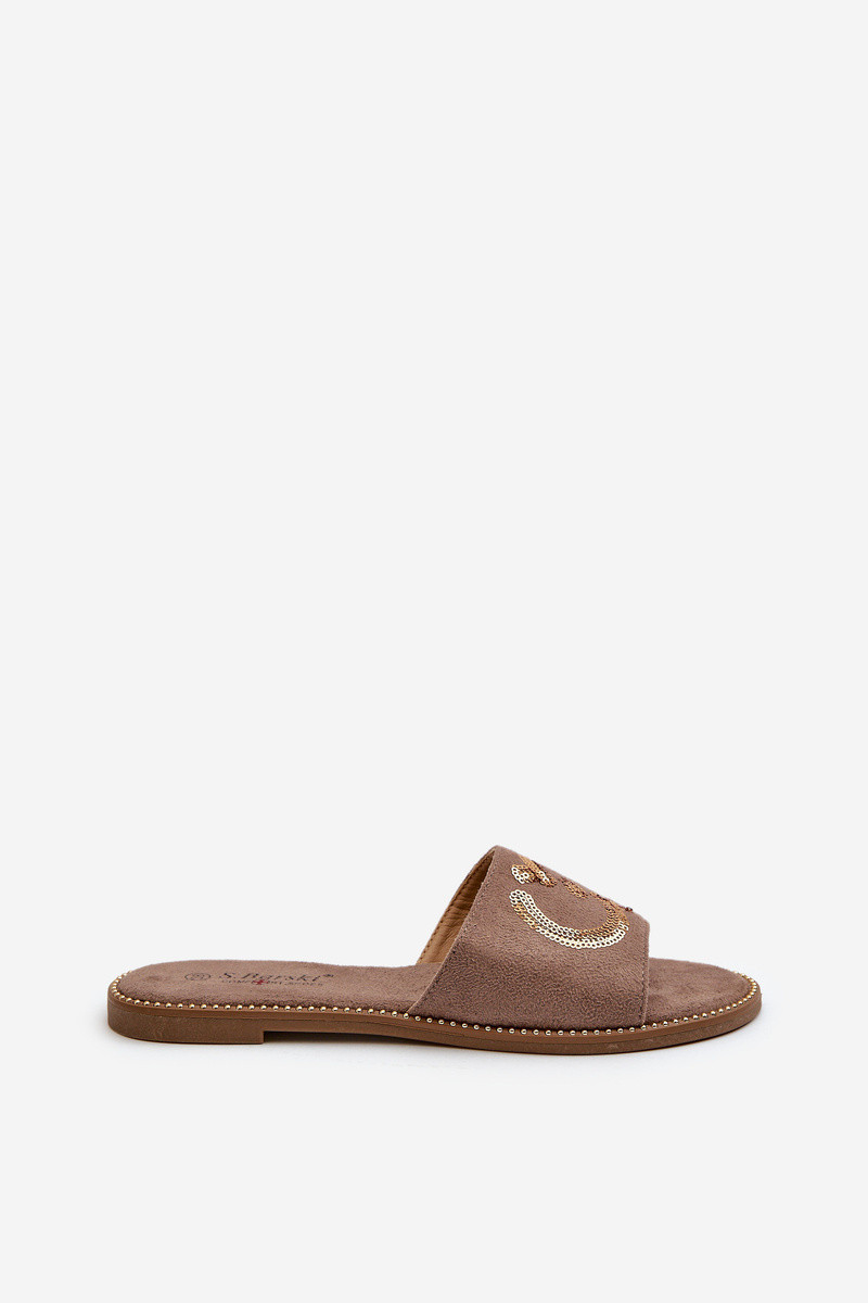 Flache Damenhausschuhe mit glänzenden Schuppen S.Barski KV27-052 in brauner Farbe