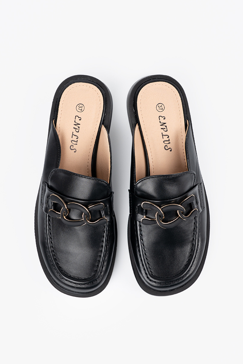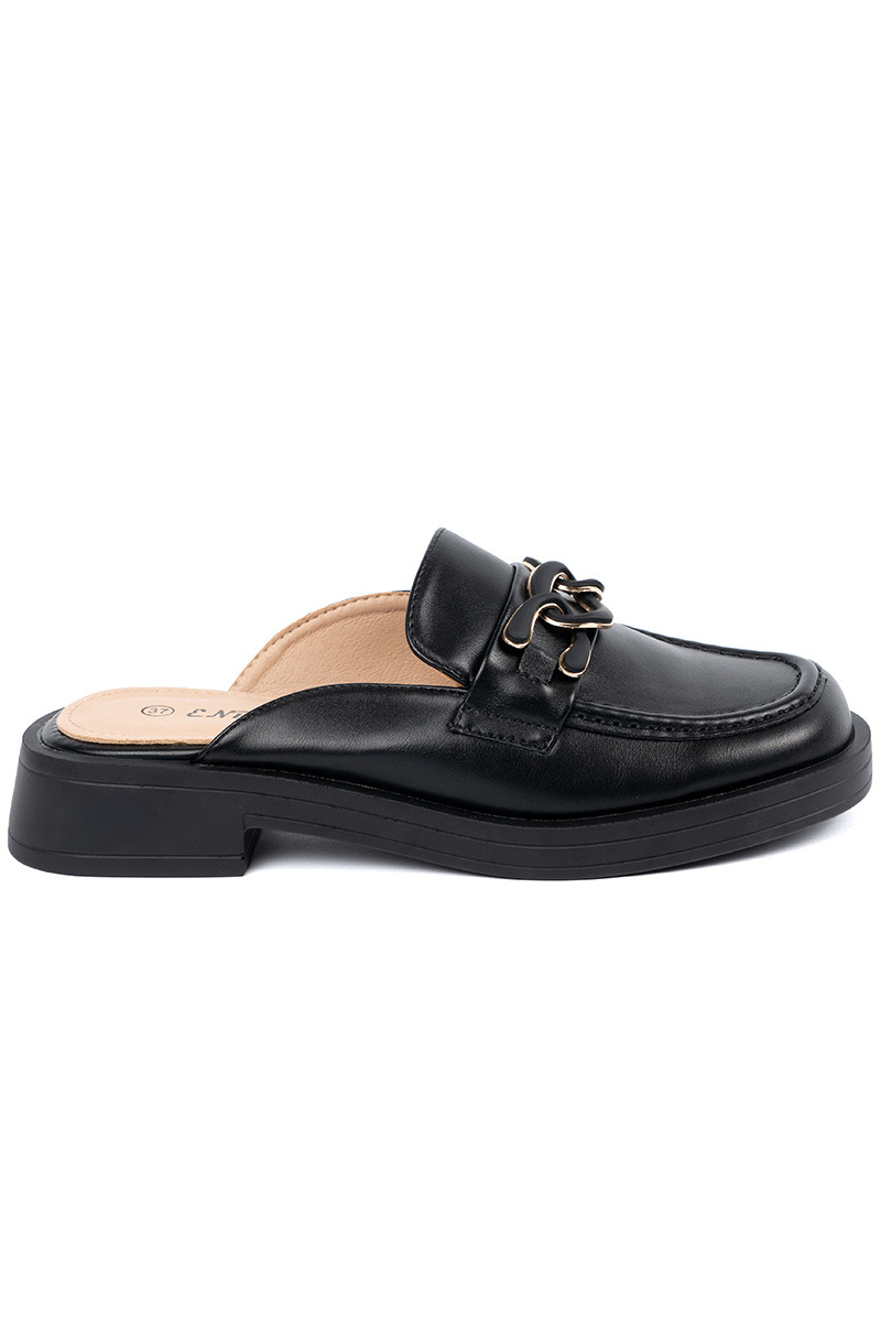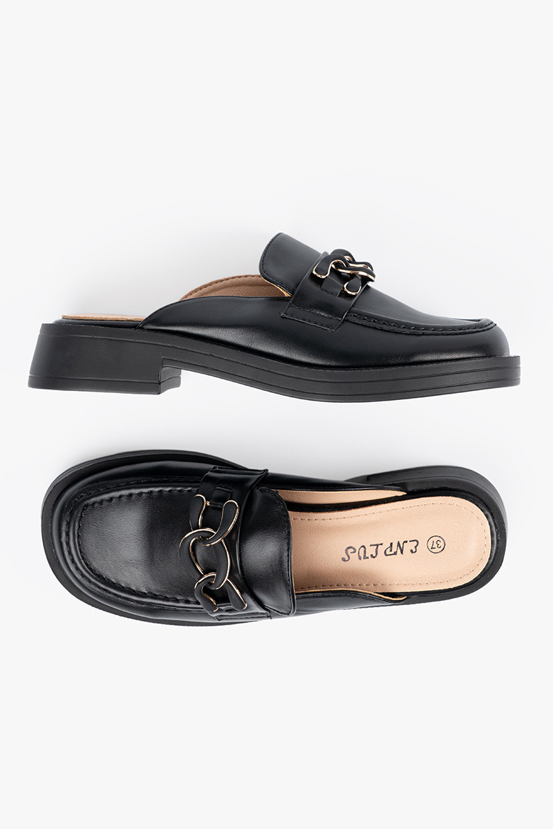 Schwarze Pantoletten aus Kunstleder mit niedriger Ferse