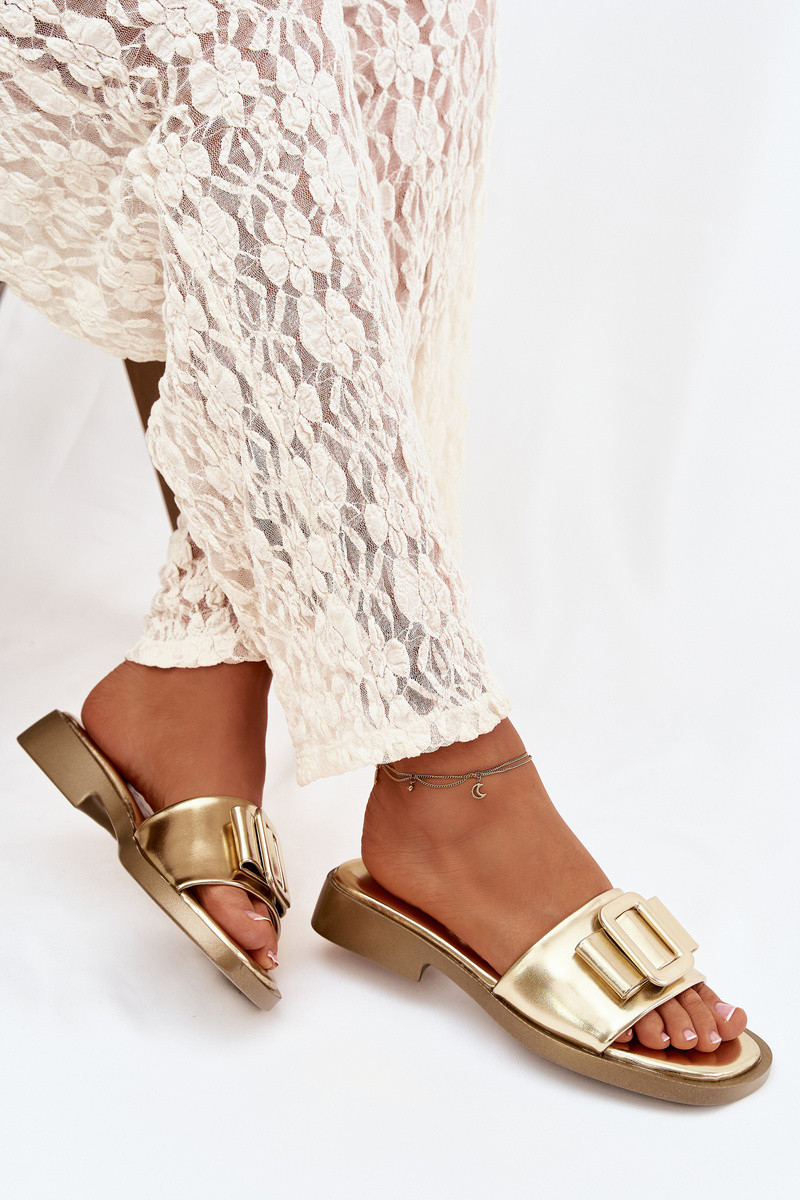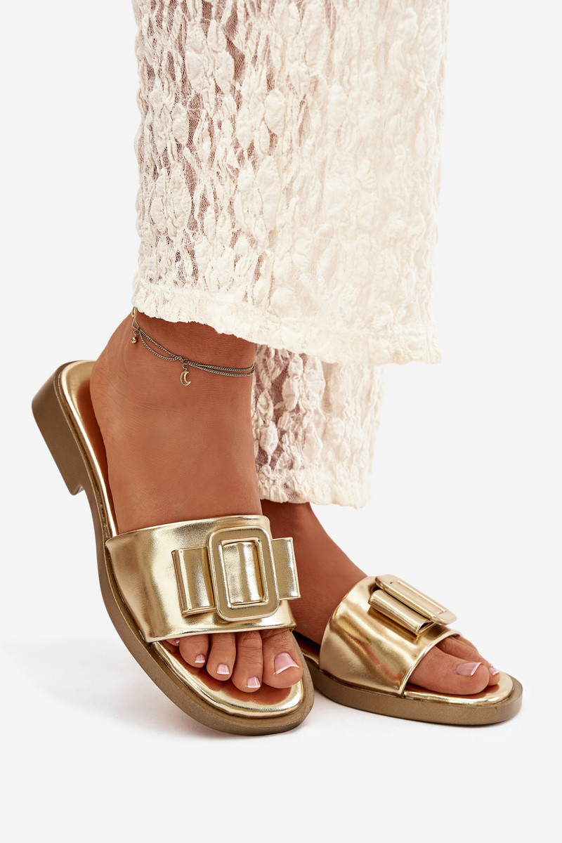 Damenhausschuhe mit breiten Absätzen mit Schnallen goldene Farbe Melivra