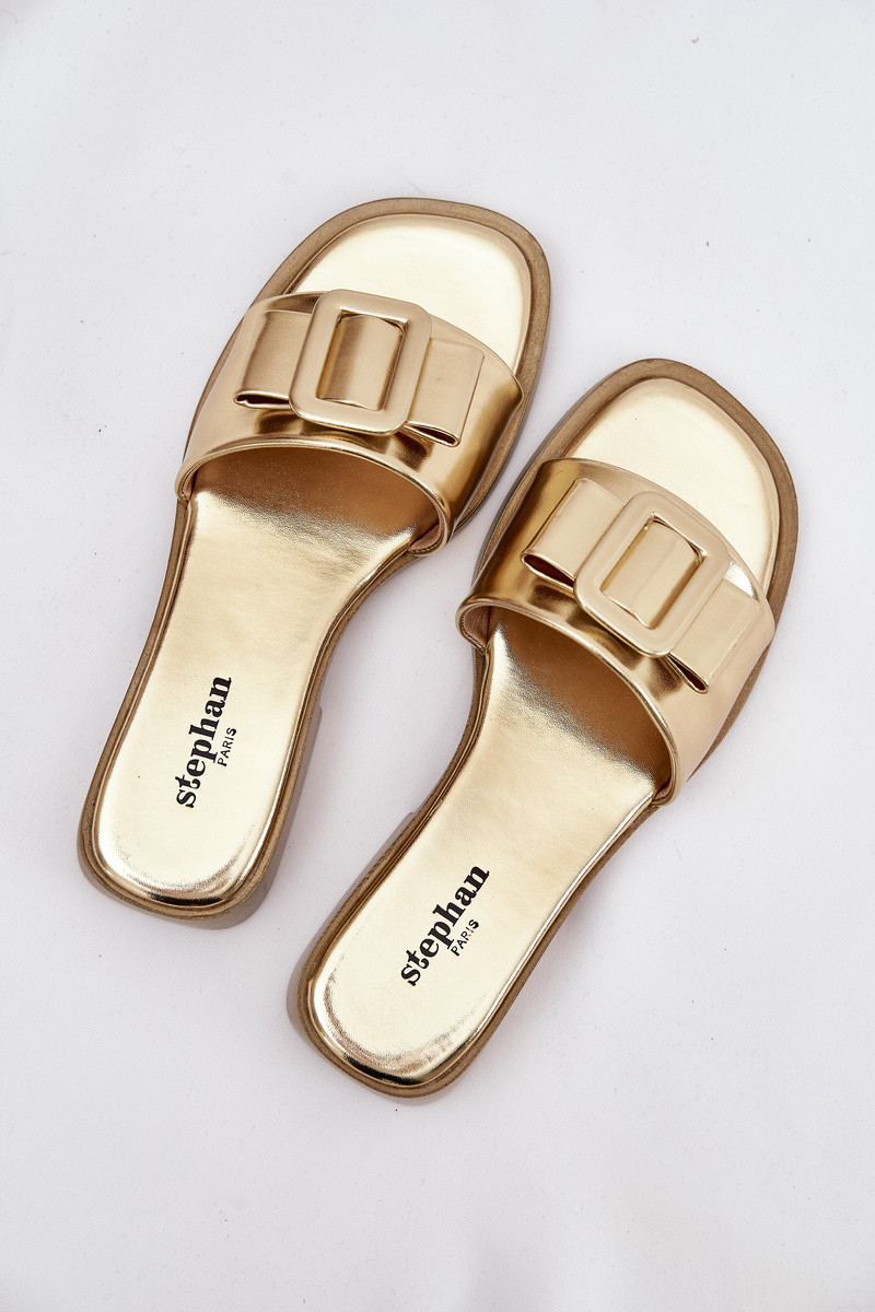 Damenpantoletten mit breiten Absätzen und Schnallen in goldfarbener Farbe „Melivra"
