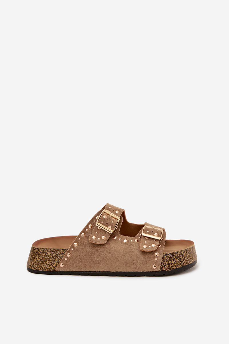 Damen khaki-farbene Pantoletten mit goldfarbenen Schnallen und Nieten Tervina