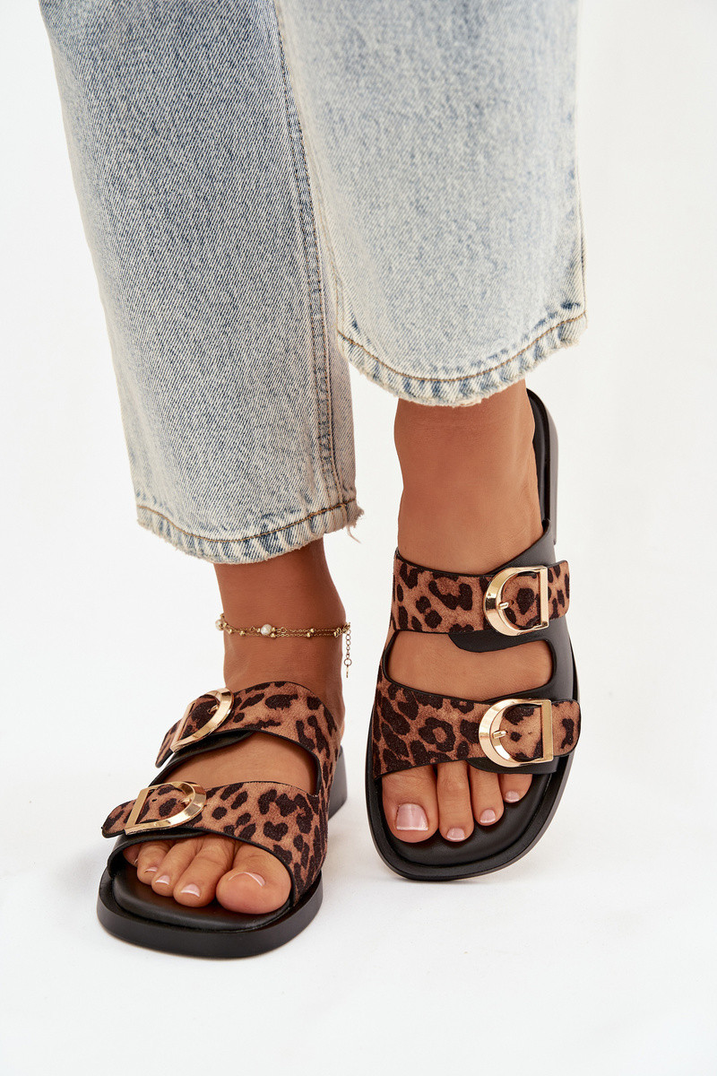 Damen-Pantoletten in Goldfarbe mit Schnallen in Leopardenmuster in Schwarz und Braun