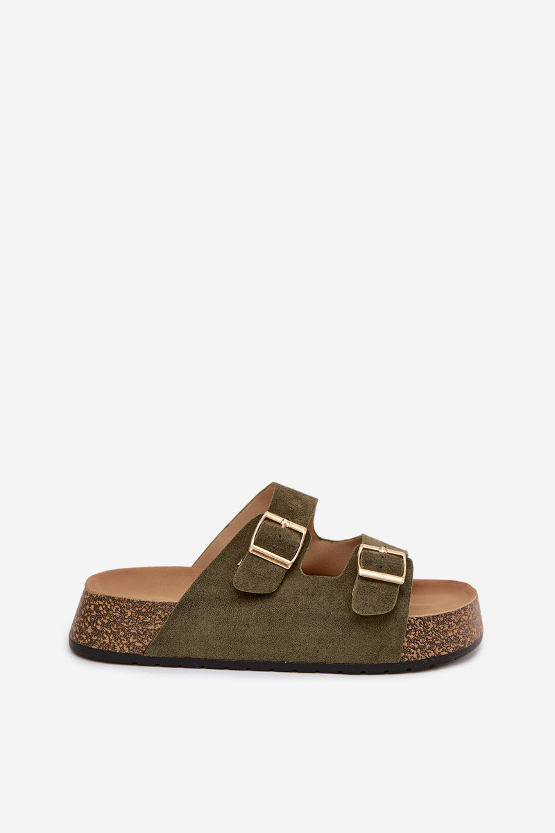 Grüne Damen-Pantoletten mit Plateausohle und goldfarbenen Schnallen „Tovessa"