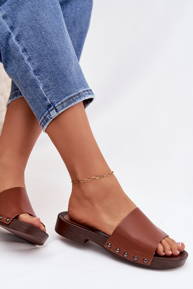 Damenhausschuhe mit Nieten mit breiten Absätzen braune Farbe Brinalle