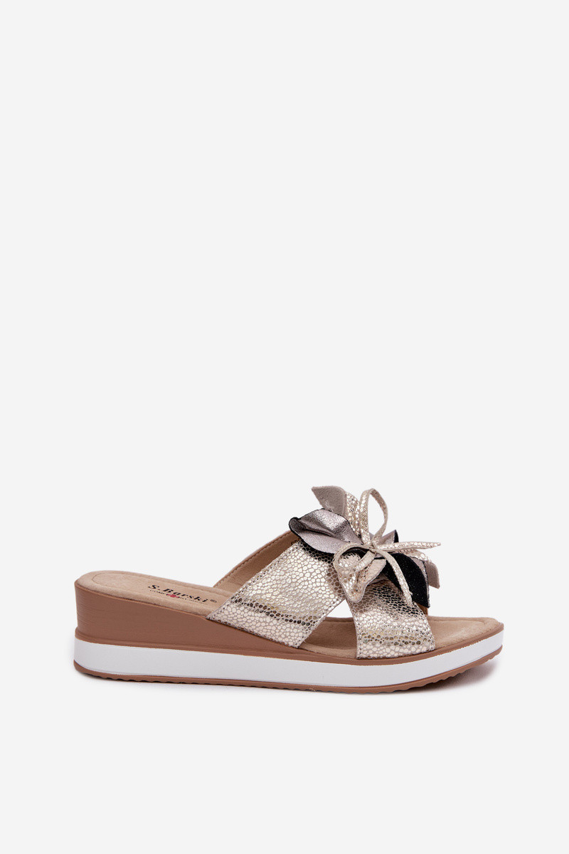 Lederhausschuhe mit einer PlattformDekoracyjnym Eine Blume S.Barski GR61-5989 goldene Farbe
