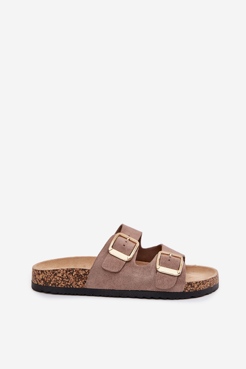 Damen sandfarbene Kunstveloursleder-Slipper mit goldenen Schnallen Vorella