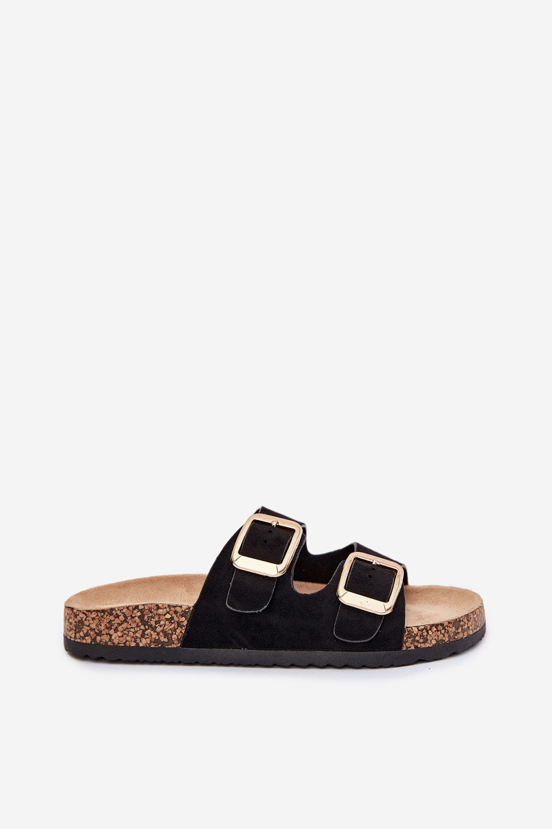 Damen schwarze Kunstveloursleder-Slipper mit goldenen Schnallen Vorella