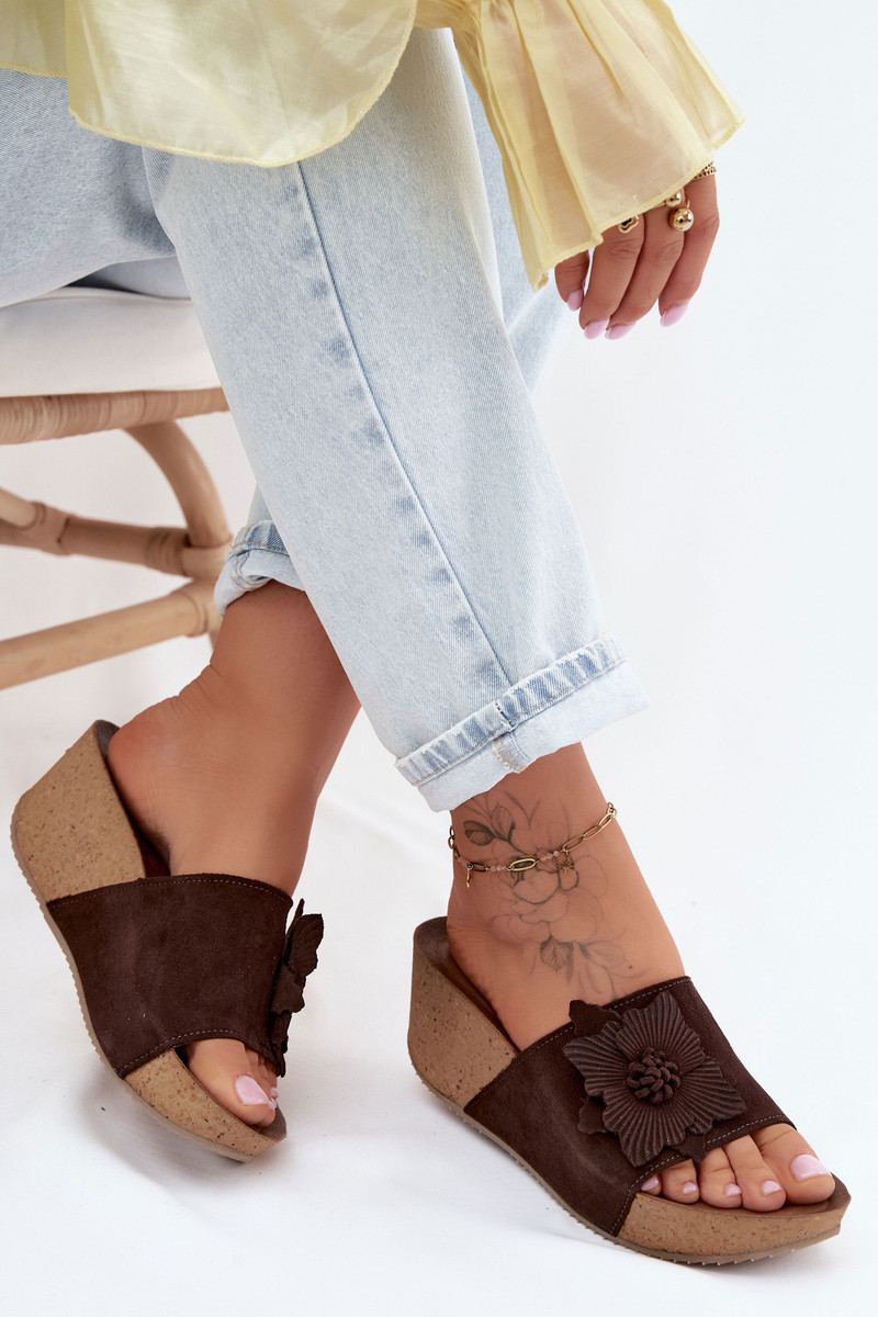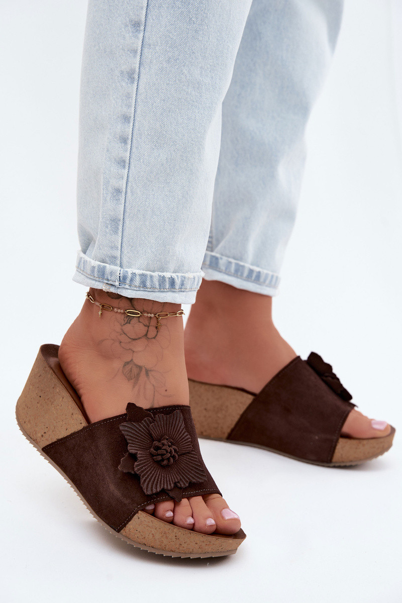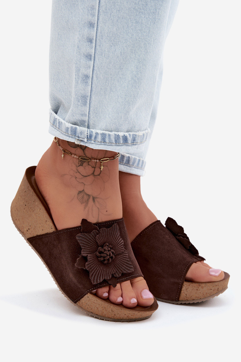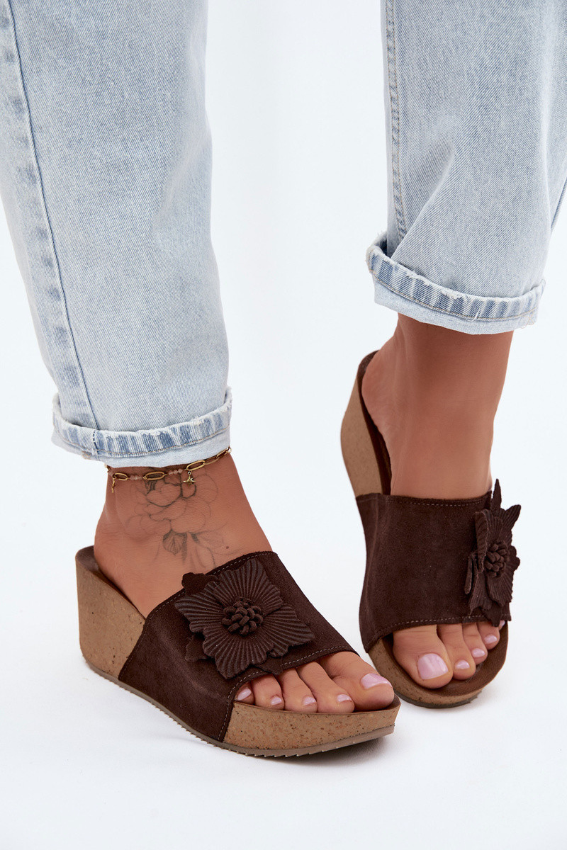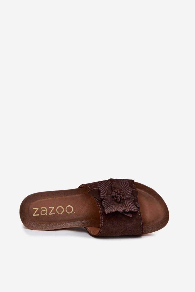 Haut INildleder-Hausschuhe für Damen mit einer Plattform Mit Dekorationen mit Blumenem Zazoo 40312 CzekoladoZue