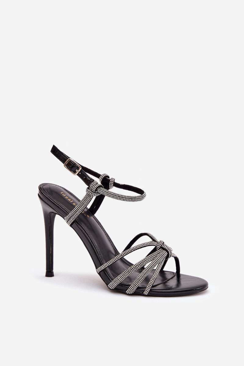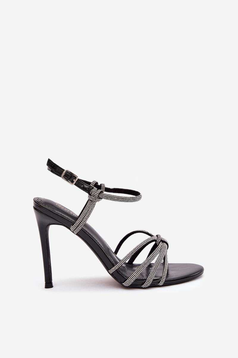 Tanelle schwarze Damen Sandalen mit dünnen Absätzen, Riemen und Zirkonia
