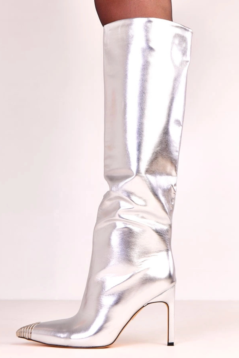 Silberne elegante kniehohe Stiefel mit metallischer Spitze Janisa