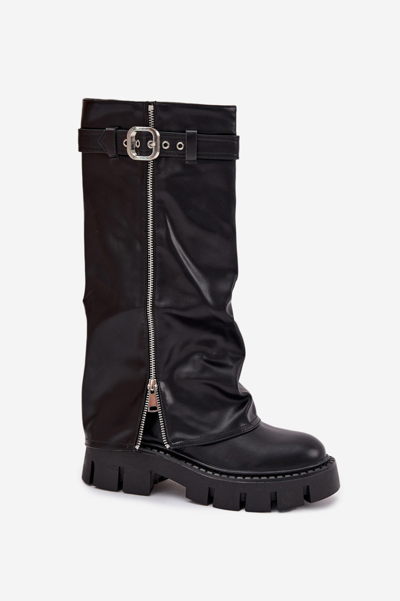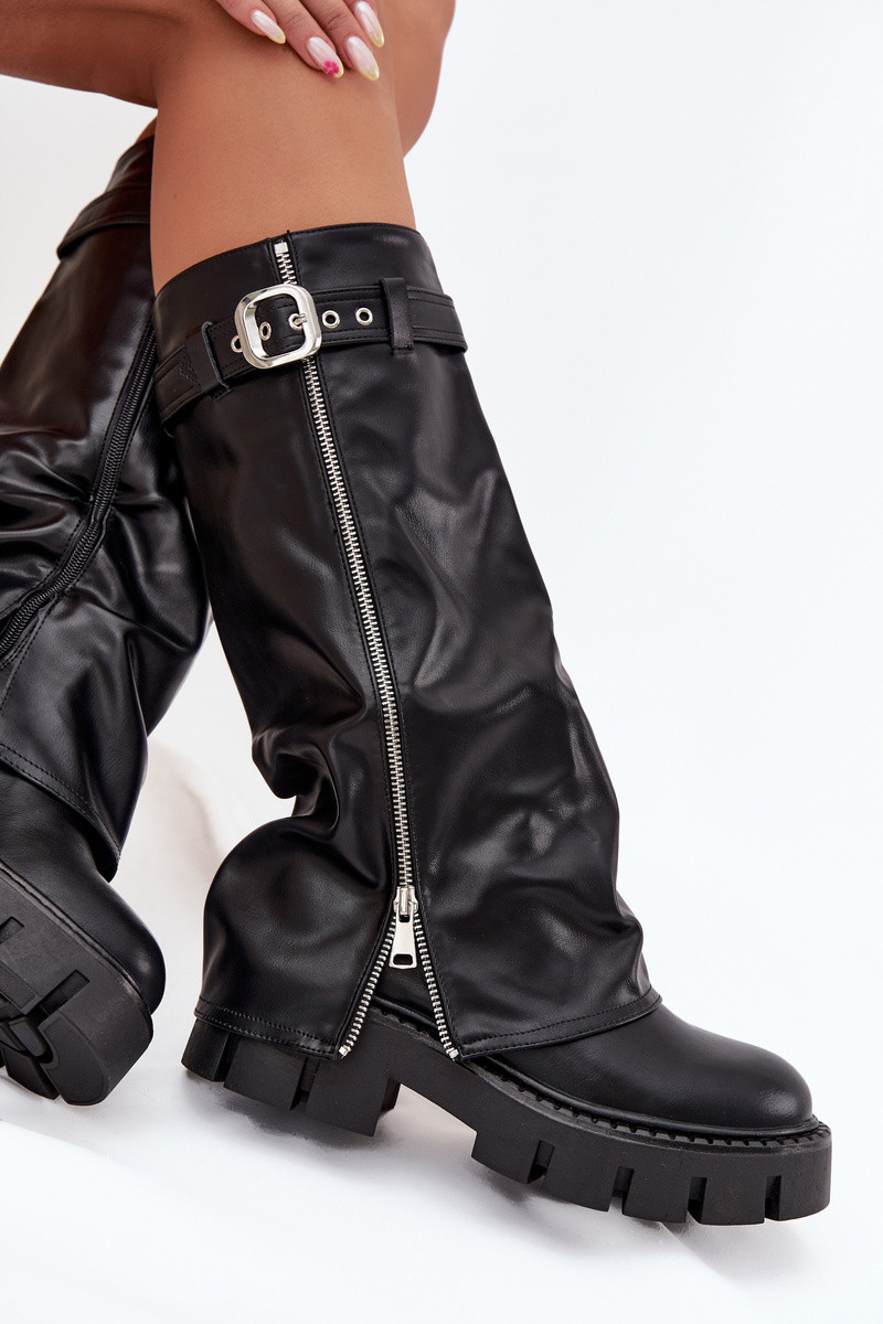 Armena Damen gefütterte kniehohe Stiefel in Schwarz mit Schnallen und silbernem Reißverschluss