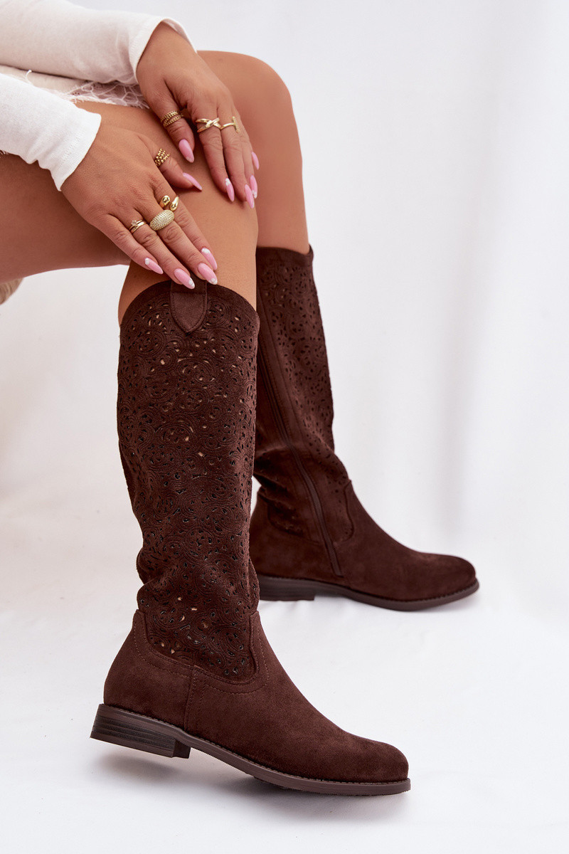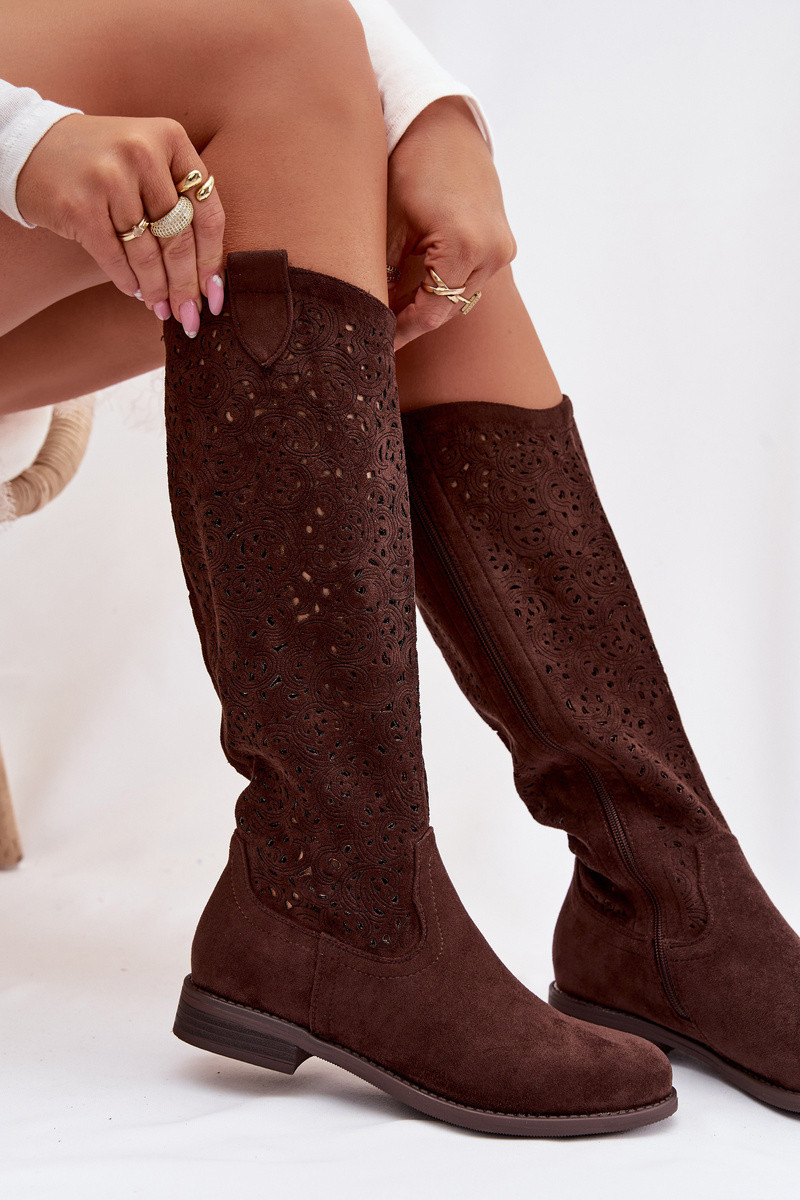 Damen Stiefel mit Lochmuster und breiten Absätzen S.Barski HY61-8023, schokoladenfarbe