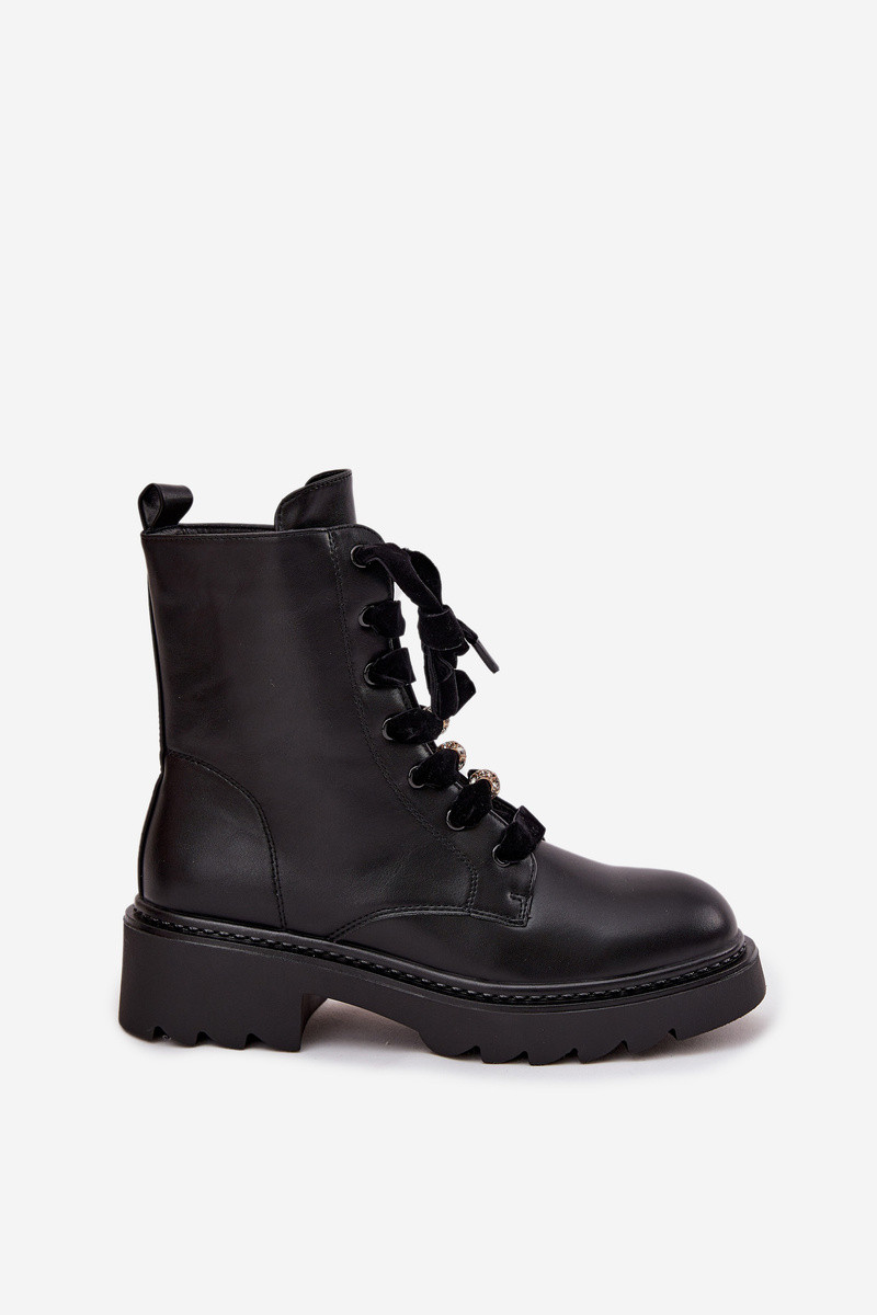 Gepolsterte Damenstiefeletten mit dekorativen Schnürungen, in schwarzer Farbe Elindra